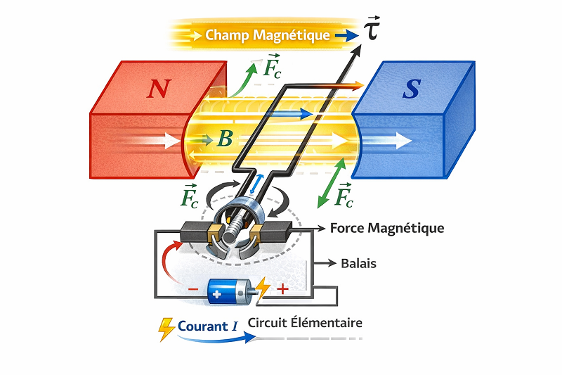 Les moteurs à courant continu transforment directement l’électricité DC en rotation mécanique. Leur conception repose sur des composants internes spécifiques : collecteur, balais et bobinages d’induit.