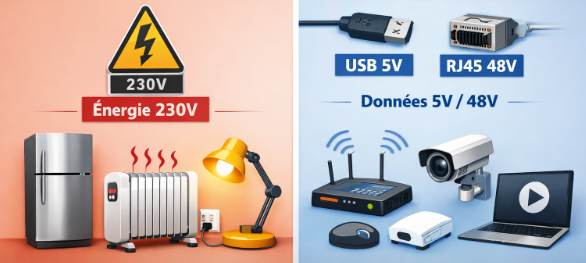 La tension forme le second critère déterminant. Tandis que le courant fort domestique fonctionne à 230 volts, le courant faible varie selon l’application. Les prises USB délivrent 5 volts. Les connexions Ethernet RJ45 atteignent 48 volts maximum.