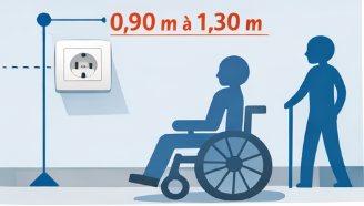 Pour les personnes à mobilité réduite, installez vos prises à 1,30 m maximum. Cette hauteur respecte les normes d’accessibilité. Tandis que l’interrupteur d’éclairage se positionne entre 90 cm et 1,30 m près de l’entrée.