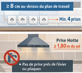 Prises cuisine : plan travail et hotte
