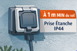 Ensuite, choisissez impérativement un matériel étanche avec un indice IP élevé (IP44 minimum). Le type de prise doit comporter un clapet de protection pour résister aux conditions extérieures. Aussi, tenez compte de la hauteur lors du passage des câbles dans des gaines TPC adaptées.