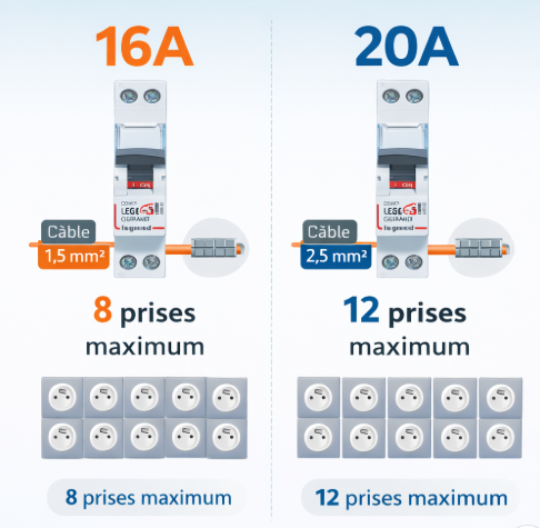Calibres de disjoncteur et ampérage : 16A et 20A